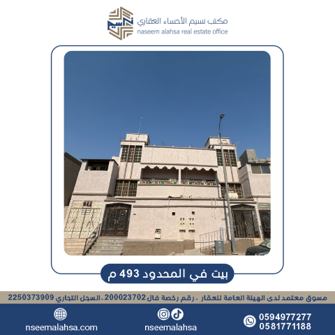 المساحة 493 م على السوم 🔹بيت يتكون من 4 شقق ( كل دور شقتين ) - 🔹الطابق الاول: ▫3 غرف نوم ▫3 دورات مياه ▫مجلس ▫غرفة طعام ▫صالة 🔹الطابق الثاني: ▫غرفتين ▫صاله ▫مطبخ ▫حمام ▫مستودع 3